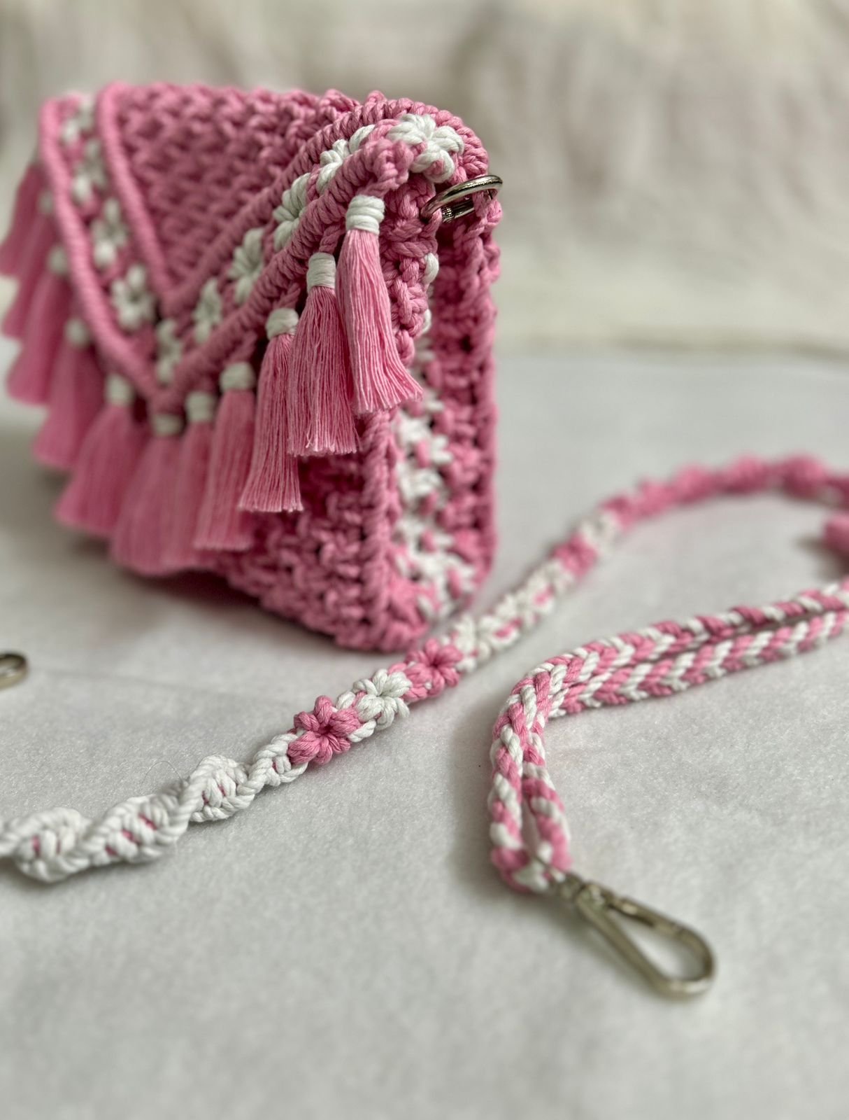Handcrafted with love in soft blush pink and ivory tones, this macramé bag features delicate floral knots and playful tassels—perfect for brunch dates, vacations, or festive outfits.
